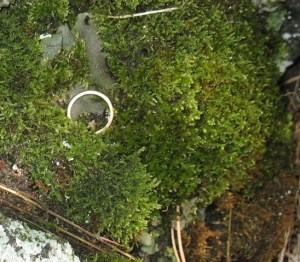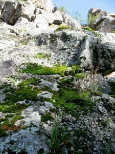 Eventually we reached the proper cliff, where we could see not only the sought-after jelly lichens, but the wonderful Sticta, and verdant masses of spikemoss, Selaginella. The jelly lichens were soft and slimy from recent rains and lingering rivulets in the cracks and crevices of the cliff. In this photo, a large Umbilicaria (lichen, not a jelly one) is under the ring, with dark Selaginella to its right, and lighter-colored masses of true mosses surrounding.