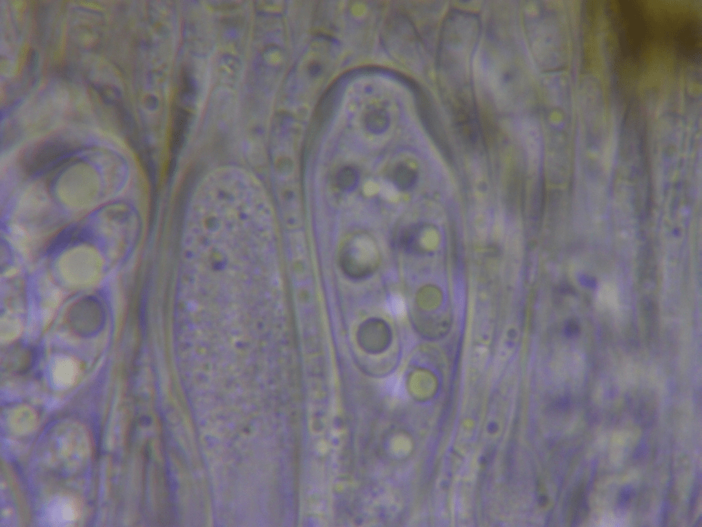 A microscopic structure found in apothecia. The structure holds a number of spores and is capable of generating a powerful burst when it is time to release the spores into the air.