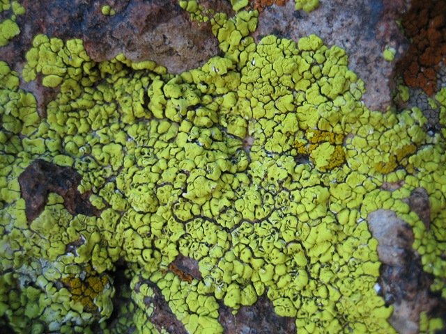 A typical, but very colorful, crustose lichen, most likely Pleopsidium flavum or something similar. (Castle Dome Peak, Utah; courtesy of A. Obbard.)