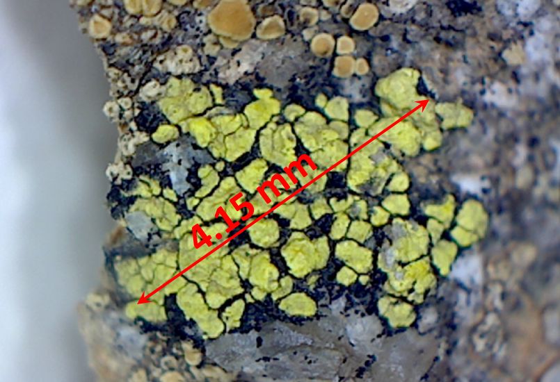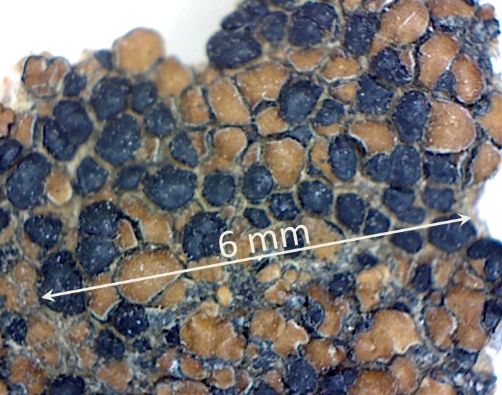 How can you identify them? Lichenologists often use chemical tests to tell various species apart, but sometimes even that is not enough. For many crustose species, it is important to look at microscopic characters such as the number and type of fungal spores in the reproductive structures (apothecia). The black apothecia (spore-producing structures) in this lichen must be cut into thin slices and examined under a microscope to determine its identity. As each apothecium is less than a millimeter (or 1/25 of an inch) across, that can be a challenge.