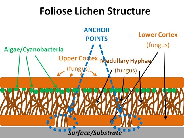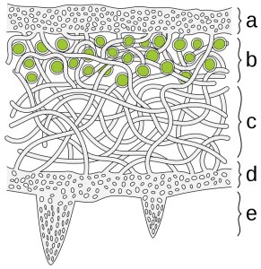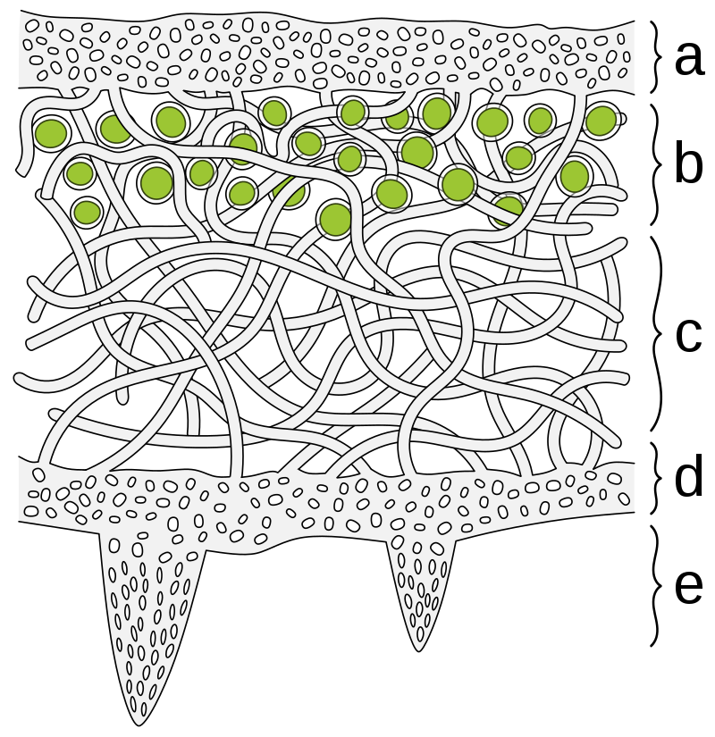 Compare this diagram, with upper (a) and lower (d) cortex, algal layer (b), and medulla (c). Thallus extensions (e), called rhizines, help anchor the lichen to the substrate. Foliose lichens are generally broadly attached to their substrates (but see Umbilicate Lichens for an exception).